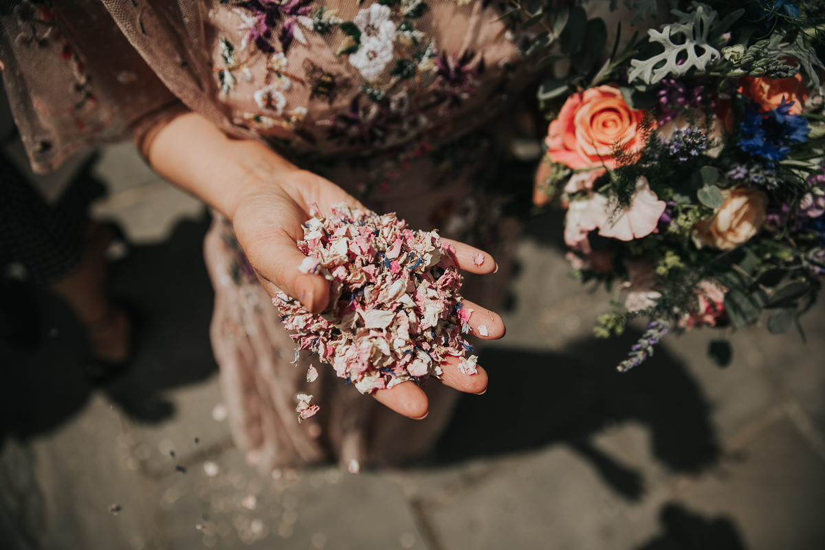 These days there are so many different types of confetti. My personal favourite is still the old-fashioned paper confetti which has coloured shapes of bells, hearts and horseshoes, which in this day and age must be biodegradable. Mix this with some larger, rainbow-coloured confetti and maybe a confetti cannon or two & you’re on to a winner! Most confetti you buy today is indeed biodegradable and you can get a whole range of rainbow colours in dissolvable paper so this doesn’t limit you to dried flowers (which will stick in your hair!). What I will recommend is that medium-sized confetti is best – too small and it won’t show up on photographs and will stick in everyone’s hair for the rest of the day, too big (such as rose petals) and it just falls to the ground too quickly. A good flutter is best and everyone wants a good flutter, so go for the coloured paper confetti option! When it comes to how much do you need, most places recommend a handful for each person – my top tip for confetti is TWO large handfuls per person if you want a really amazing confetti experience and epic photographs!